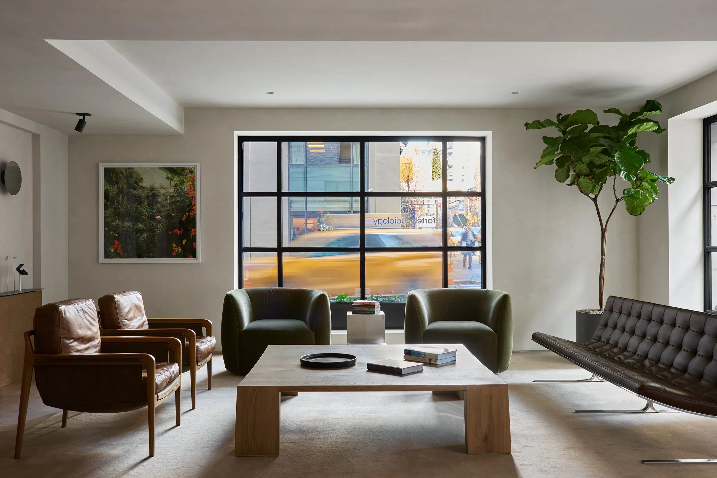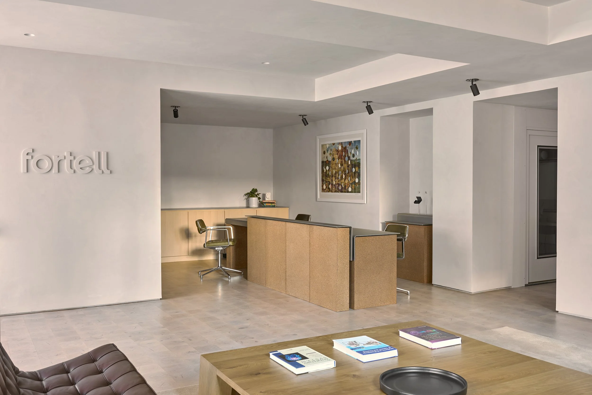 End-grain white oak flooring evokes the familiarity of an Upper East Side parquet living room, reinterpreted with a contemporary sensibility. Together, these restrained yet tactile elements create an inviting clinical environment, one that reflects Fortell’s commitment to cutting-edge technology grounded in deeply human experience.
