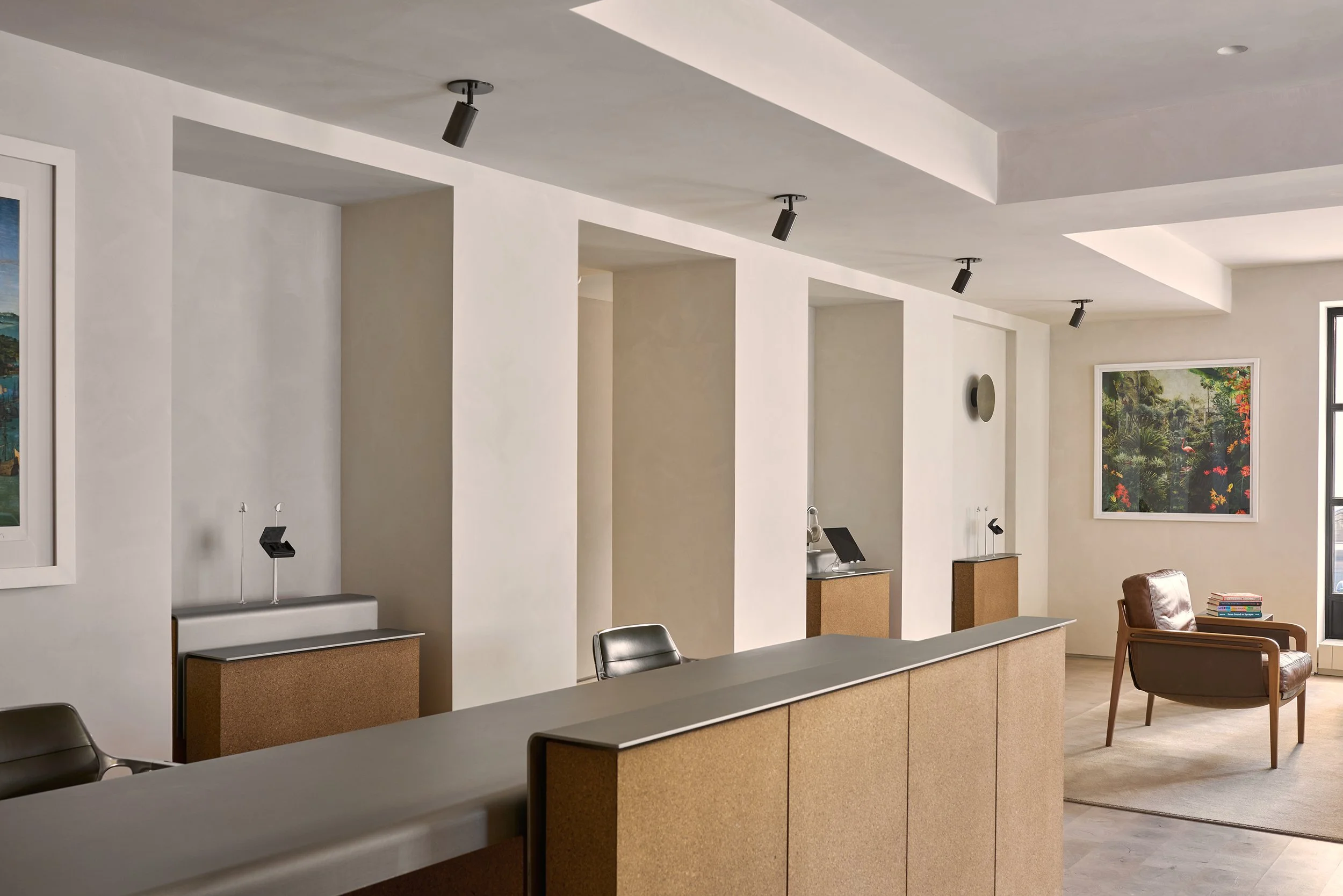 The planning strategy prioritizes daylight, allowing natural light to reach every room, while soft-toned curtains and walls introduce warmth and comfort throughout. At the reception area, carefully calibrated spot lighting highlights custom displays and a curved steel-and-cork desk; materials that reference both Fortell’s advanced technology and the acoustic performance of its products.