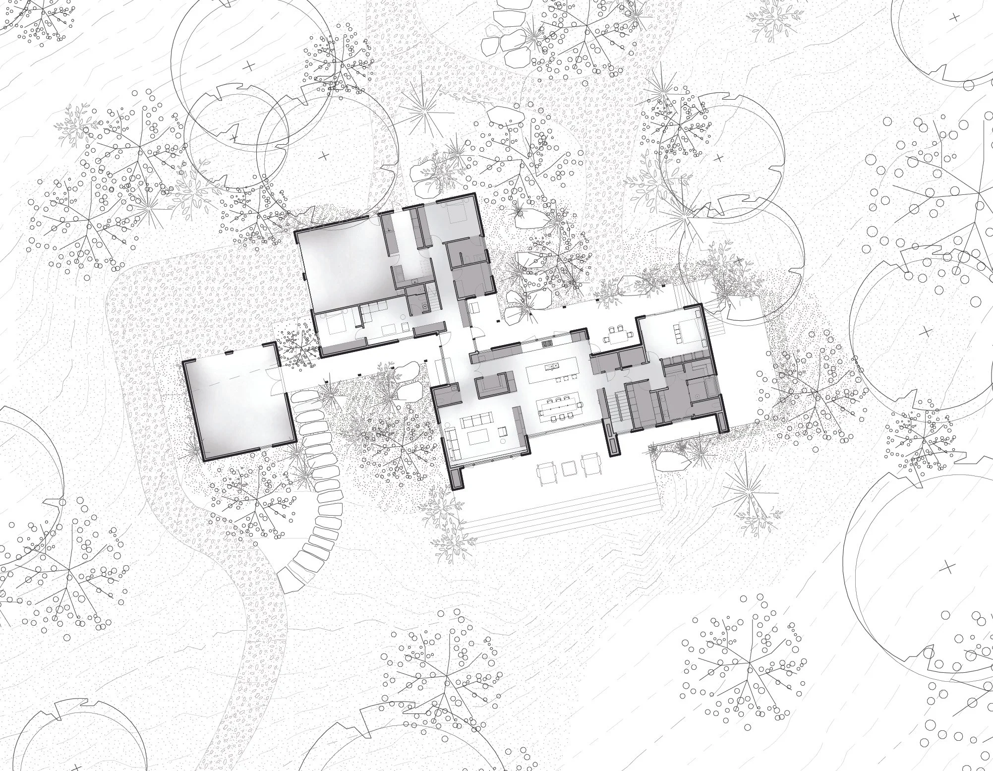 Siting on top of and expanding the existing homes’ foundations, the project aims to minimize sitework and disruption to the existing ecosystem and natural drainage of the site. The space between architecture and landscape become blurred; beautifully landscaped “courtyards” are connected through covered porches that connect the front to the back seamlessly.